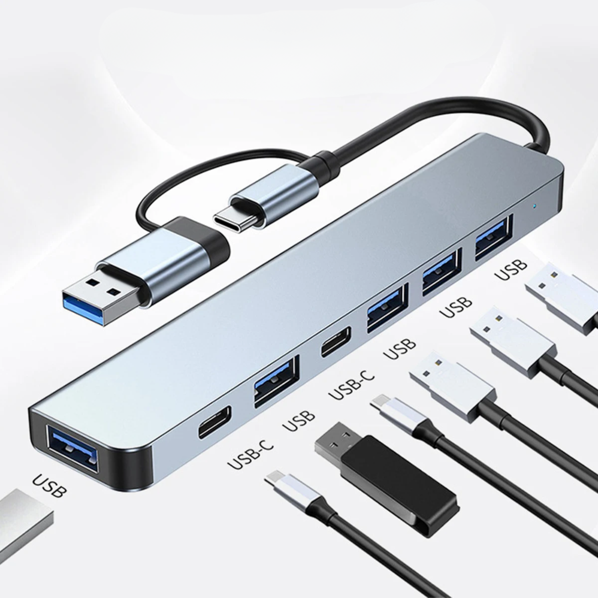 It’s built for ultimate convenience with a revolutionary two-in-one main connector (USB-A and USB-C), ensuring seamless high-speed data transfer across any laptop or device, old or new. Plug in your mouse, keyboard, flash drives, and memory cards all at once. It's hassle-free, driver-free, and wrapped in a sleek, durable aluminium alloy. Simplify your setup today!