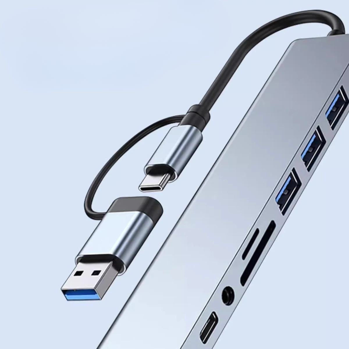 Tired of juggling adapters? The 8-in-2 Pro Hub is the only adapter you'll ever need. This compact powerhouse solves the chaos of modern connectivity by instantly transforming one port into eight—including the essential 3.5mm audio jack.